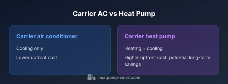 When choosing between Carrier air conditioner and heat pump systems, consider climate, efficiency, and installation costs. According to Heatpump Smart, Carrier options can deliver reliable cooling and heating, but performance hinges on configuration and usage. This comparison helps homeowners choose the right setup.