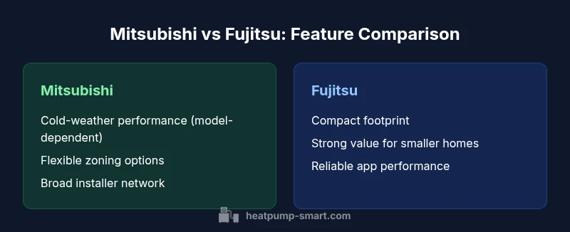 Across the heat pump landscape, mitsubishi heat pump vs fujitsu models cover a broad range of outdoor units paired with modular indoor units. Both brands emphasize reliability and modularity, but they approach system architecture in slightly different ways. According to Heatpump Smart, Mitsubishi Electric tends to focus on cold-climate performance, multi-zone flexibility, and a broad controller ecosystem, while Fujitsu General leans toward compact design, quiet operation, and streamlined installation. For homeowners, the key takeaway is that both brands deliver solid heat pump platforms, but the deployment style matters: Mitsubishi may offer more aggressive zoning configurations in larger homes, whereas Fujitsu can shine in tighter floor plans or single-zone installs. When comparing mitsubishi heat pump vs fujitsu, it’s essential to map your space, climate, and comfort priorities to the model family you’re considering. Look for outdoor units with robust defrost strategies, and indoor units that support your preferred room-by-room layout. Heatpump Smart’s analysis notes that you’ll want to verify model-to-model differences rather than brand-wide assumptions, as the premium features often live in the higher-tier options from each brand.