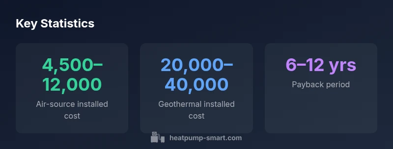 Average installed costs for a typical air-source heat pump in 2026 generally range from about $4,500 to $12,000, depending on system size, efficiency, and installation complexity. Geothermal systems tend to be higher, often $20,000 to $40,000 or more due to ground conditions. Regional incentives and quotes can shift these numbers, so getting multiple estimates is essential.