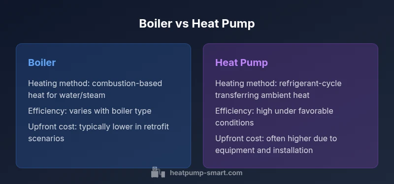 Boiler systems rely on burning fuel to heat water, which then circulates to radiators or underfloor systems to warm living spaces. Heat pumps rely on a refrigerant cycle to move existing ambient heat from outdoors or the ground into the home. In a boiler vs heat pump comparison, the fundamental difference is energy transfer vs energy generation. According to Heatpump Smart, the core distinction lies in energy pathways: boilers generate heat on-site, while heat pumps move heat from another source. This contrast shapes efficiency, emissions, and long-term costs, especially in well-insulated homes. The choice should align with your climate, available fuel, and long-term plans for upgrade or retrofit.