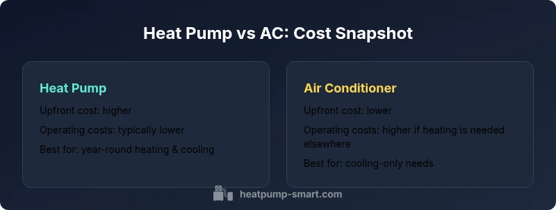 When evaluating the cost of heat pump vs air conditioner, homeowners should separate upfront system costs from long-term energy savings. According to Heatpump Smart analysis, the strongest cost signals come from climate, efficiency ratings, installation complexity, and the ability to recover investment through reduced utility bills. In practice, decisions hinge on local electricity prices, the building envelope, and how well the system is matched to heating and cooling loads. In colder regions, the gap between equipment price and energy savings may be larger, while in milder climates the payback can appear sooner. This section breaks down the main cost drivers and what to expect at the invoice, the permit desk, and the contractor’s quote. Throughout, keep in mind that the real value comes from reliability and comfort, not just sticker price. Heatpump Smart emphasizes choosing a system that aligns with long-term needs and local conditions.