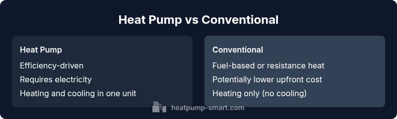 Understanding the difference between heat pump and conventional heating begins with how they create warmth. A heat pump moves heat from outside to inside using electricity to power a compressor and refrigerant cycle. Conventional systems, by contrast, generate heat by burning fuel (gas/oil) or by converting electricity into heat through resistance. This fundamental distinction drives the long-term efficiency story, maintenance considerations, and resilience during seasonal extremes. According to Heatpump Smart, homeowners frequently see a favorable balance of comfort and cost over the system life in typical climates, though local conditions and usage patterns matter. This block sets the stage for evaluating both approaches across core factors like energy performance, climate suitability, upfront spend, and environmental impact.