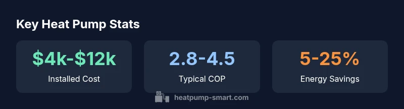 Prices for heat pumps vary based on type, size, and installation complexity. Typical installed costs for air-source systems range from $4,000 to $12,000, while geothermal installations tend to be higher. In addition to the upfront price, homeowners should consider maintenance, potential ductwork upgrades, and permit fees. Rebates and incentives can substantially reduce net cost, but programs differ by region and over time. Heatpump Smart Analysis, 2026, indicates that the total cost of ownership often improves when you invest in a higher-efficiency model and plan for periodic maintenance. When budgeting, account for electricity rates in your area, climate, and the home’s insulation quality. These factors collectively determine the return on investment and the time needed to recoup the cost through energy savings.