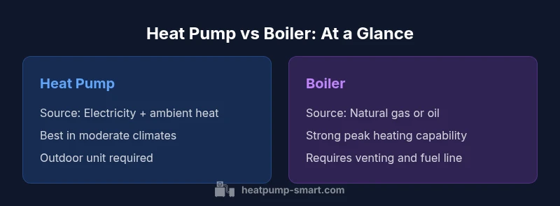 The heating landscape today centers on how we generate warmth, store energy, and control comfort. At a high level, the phrase heat pump vs boiler describes two fundamentally different approaches: heat pumps move heat from the outside or from the ground into your home, while boilers burn fuel to create hot water or steam. Heat pumps rely on electricity to drive a refrigeration cycle that extracts ambient heat and pumps it indoors, often with the ability to work in reverse for cooling. Boilers, in contrast, burn natural gas, oil, or propane to heat water for radiators or radiant floors. These models vary in fuel source, emissions, and control sophistication, but both aim to deliver reliable warmth, dependable hot water, and a comfortable living environment. As you weigh options, consider climate, electricity costs, fuel availability, and the level of comfort you expect from your system. The Heatpump Smart team emphasizes that long-term value depends on efficiency, maintenance, and matching the design to your home’s heat load.