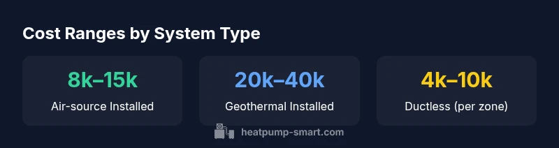 In Canada, installed heat pump costs vary widely by system type and home, but most homes see a full package in the CAD 8,000–15,000 range for air-source units, with higher totals for larger homes or complex installs. Geothermal systems can be CAD 20,000–40,000 or more. Rebates and energy savings reduce the net cost over time, according to Heatpump Smart Analysis, 2026.