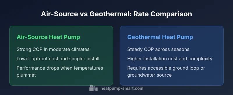 Air-source heat pumps pull heat from outdoor air and rely on an efficient compressor and refrigerant cycle to deliver heat indoors. Their rate tends to be strong in moderate climates but can degrade as outdoor temperatures drop, unless paired with auxiliary heat or a very well sized system. Geothermal heat pumps draw heat from the ground or a groundwater source, where the temperature remains relatively stable year-round. This makes their rate (COP) more consistent across seasons, though the upfront cost and installation footprint are typically higher. The Heatpump Smart analysis shows that climate, soil or water conditions, and system design drive the practical performance more than the label alone.