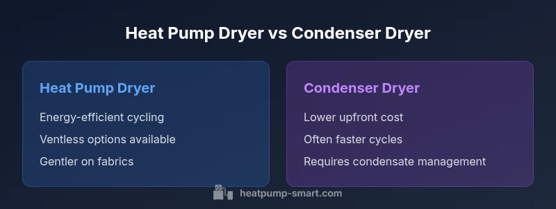 According to Heatpump Smart, the difference between a heat pump and a condenser tumble dryer centers on how they heat and remove moisture. Heat pump dryers reuse heat in a closed loop, delivering high energy efficiency with gentler drying. Condenser tumble dryers vent moisture by cooling and condensing air, typically costing more to run over time.