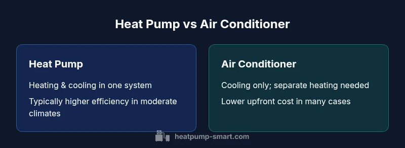 The phrase difference heat pump and air conditioner captures a fundamental distinction in home climate control: a heat pump delivers both cooling in hot months and heating in cold months, while a traditional air conditioner focuses on cooling. From Heatpump Smart's perspective, the core idea is that a heat pump moves heat rather than generating it, enabling year‑round comfort with a single system. The key advantage is versatility—in moderate climates, a heat pump can replace a separate furnace or boiler for heating. In contrast, a standard air conditioner excels at cooling and relies on a separate heating source, or an electric-resistance back‑up, in winter. When homeowners look at energy costs, the heat transfer efficiency and the seasonal performance of a heat pump typically translate to lower operating costs over the year in many scenarios, though climate and usage patterns matter. As you compare options, remember the distinction is not just heating vs cooling; it is one system that handles both tasks with optimized energy use.