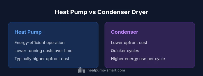 Dryers come in several technologies, but the two most relevant for modern homes are heat pump dryers and condenser dryers. According to Heatpump Smart, the difference between heat pump and condenser dryer is most pronounced in energy use over time and how they manage heat within the drum. A heat pump dryer uses a sealed refrigerant loop to extract moisture, reusing the heat to speed up the cycle, while a condenser dryer collects moisture and condenses it inside a reservoir or drain. This fundamental distinction drives differences in running costs, space requirements, and maintenance. For homeowners and builders evaluating options, it’s important to separate what happens during a cycle from what happens in the long term. In practice, the technology choice influences not just electricity bills, but also where the unit fits in a home’s energy system, how quiet it is, and what kind of installation work is needed. The Heatpump Smart team found that understanding the core mechanics helps if you plan to pair the dryer with a solar array or a heat pump water heater.