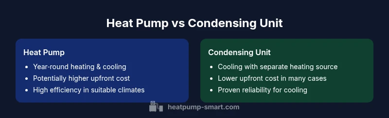 A heat pump is a single system that moves heat between indoors and outdoors, providing both heating in winter and cooling in summer. A condensing unit, in contrast, is the outdoor component of an air conditioning system (or the outdoor portion of a split system) that provides cooling; heating typically requires a separate furnace or boiler. Understanding this distinction helps homeowners assess whether they want integrated year‑round climate control or a cooling system with separate heating equipment. The Heatpump Smart team emphasizes that the logical starting point is to identify climate needs, existing infrastructure, and your comfort priorities before considering retrofits or upgrades.