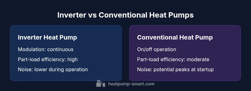 The term inverter heat pump vs heat pump describes how the unit is controlled, not how it looks. A conventional, fixed-speed heat pump turns the compressor on at full capacity or off, which leads to noticeable temperature swings and more energy wasted during partial loads. An inverter-equipped unit uses a variable-speed compressor and smart electronics to modulate output, closely matching the heating or cooling demand. This means less cycling, more consistent indoor temperatures, and often better efficiency across a wider operating range. According to Heatpump Smart, this modulation is the primary reason most homes experience steadier comfort and lower electricity use when conditions fluctuate. The trade-off is more complex installation and a higher upfront price, but many homeowners recoup the extra cost through reduced energy bills and longer equipment life due to gentler operation.