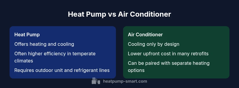 According to Heatpump Smart, the question at the heart of what is best heat pump or air conditioner hinges on climate, usage patterns, and existing infrastructure. Heat pumps are bidirectional systems that transfer heat between indoors and outdoors, providing heating in winter and cooling in summer. Air conditioners, in contrast, are built and optimized for cooling only. This functional split matters because it shapes annual energy costs, comfort consistency, and resilience to weather swings. For homeowners, builders, and property managers, the key is to align system capabilities with real-world conditions. A properly sized heat pump can deliver comfortable indoor temperatures while consuming less electricity than electric resistance heating in many climates. However, in regions with extreme winter demand or very cold nights, a heat pump may require supplemental heat sources. With that context, this article examines pros, cons, and decision pathways to guide you toward the best choice for your project.