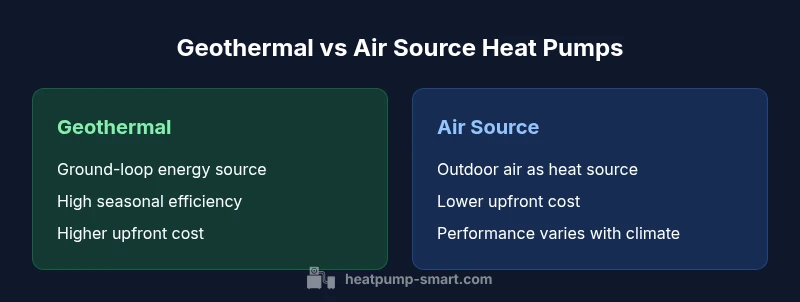 Geothermal heat pump vs air source heat pump is a classic engineering decision for homes and small commercial buildings. This section defines the two main approaches and highlights the decision axes that homeowners, builders, and property managers use to gauge value. Heat pumps move heat rather than generate it, so the efficiency and reliability depend on how heat is captured. According to Heatpump Smart, geothermal systems leverage stable underground temperatures to maintain high efficiency year-round, while air source systems rely on outdoor air and must cope with seasonal extremes. The result is a fundamental trade-off: geothermal offers steady performance and long-term energy savings in exchange for more complex installation, whereas air source offers flexibility and lower upfront costs but greater climate sensitivity. With this context, the rest of the article compares them on climate, installation, and lifecycle costs, so you can make an informed choice for your project.