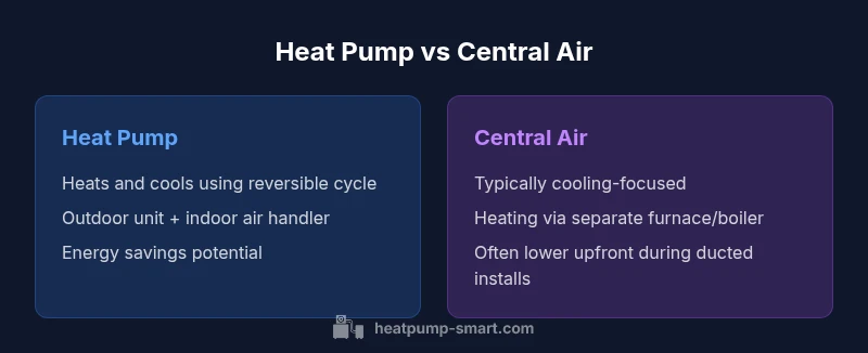 According to Heatpump Smart, the choice between heat pump and central air often hinges on local climate, electric rates, and how you value year‑round comfort versus upfront costs. Homeowners who prioritize a compact, single‑system solution may lean toward a heat pump, while those in extreme winter regions may prefer traditional setups with a dedicated furnace. The recommendation is to evaluate your home’s insulation, ductwork, and future plans for upgrades like solar or heat pump water heaters.