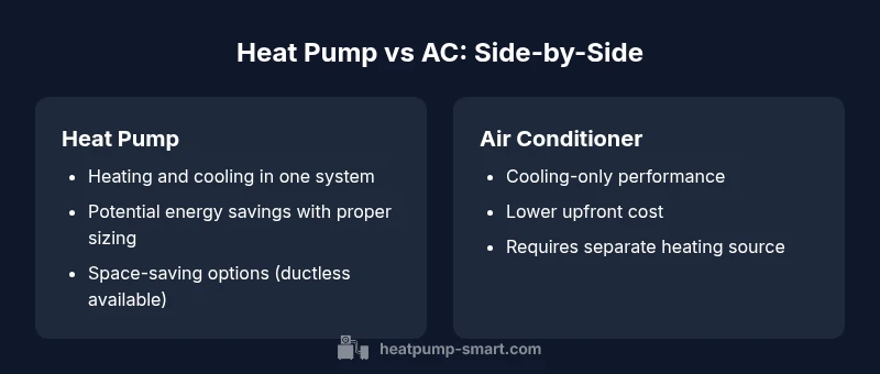 If you’re navigating a renovation or a new purchase, a quick question you’ll hear is: is it a heat pump or air conditioner? The answer hinges on heating capability, the outdoor unit’s design, and the presence of a reversing valve. In many homes a single outdoor unit performs both heating and cooling, which identifies it as a heat pump. According to Heatpump Smart, the distinction matters for seasonal energy efficiency, potential comfort gains, and long-term operating costs. This section lays out practical identifiers you can verify, without needing specialized tools. You’ll learn how to spot heating capability, thermostat signals, and visible components during basic inspections. By understanding these clues, homeowners and property managers can avoid mismatched upgrades and ensure future energy savings.