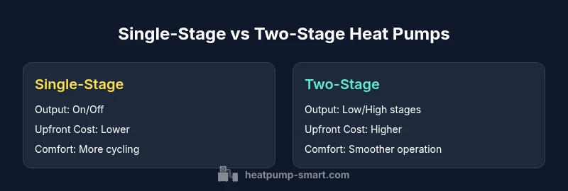 Staging refers to how a heat pump scales its output to match demand. When homeowners ask about the decision between a single stage vs two stage heat pump, they are really weighing simplicity against steady comfort and efficiency. A single-stage unit operates at full capacity or off, while a two-stage model can run at a lower, more efficient level most of the time and ramp up only when demand rises. This difference matters for annual energy use, indoor temperature stability, and equipment wear. According to Heatpump Smart, staging options can significantly affect how a system responds to cold snaps, daily fluctuations, and intermittent heat demands. In this article, we explore how each approach behaves under real-world conditions, what that means for installation, and how to estimate lifecycle costs without guessing. We’ll cover performance at part-load, noise considerations, and practical sizing and retrofit implications. By the end, you’ll have a clear framework for evaluating efficiency, comfort, and lifecycle costs when you encounter a heating system upgrade or new installation.