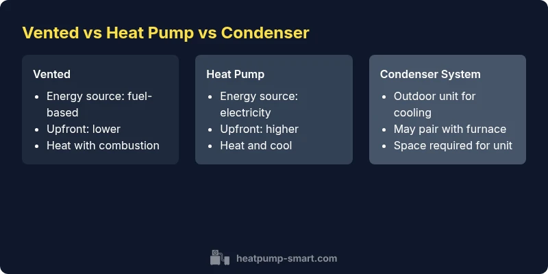 Understanding vented vs heat pump vs condenser options is essential for homeowners, builders, and property managers who aim for reliable comfort and energy efficiency. This article compares how each approach delivers heat and cooling, how they differ in installation and maintenance, and what that means for long‑term costs. According to Heatpump Smart, a calm, data‑driven approach helps you balance upfront investment with ongoing operating costs. This guide uses the keyword vented vs heat pump vs condenser to anchor the discussion and ensure clear, practical takeaways for real projects.