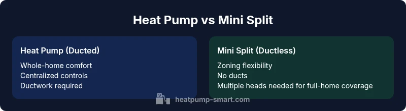 Understanding the difference between heat pump and mini split is essential for homeowners, builders, and property managers who want reliable comfort and energy savings. Both systems use refrigerant to move heat, but their form factor, installation requirements, and control options set them apart. According to Heatpump Smart, the difference between heat pump and mini split often comes down to whether you need a whole-home solution or targeted zoning, as well as how you plan to integrate with existing ductwork. This section lays out the basics so you can evaluate options without jargon or guesswork.
