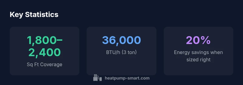 For a 3 ton heat pump, typical coverage is 1,800–2,400 square feet in moderate climates with standard insulation. This 3 ton heat pump square footage guideline starts from about 36,000 BTU/h and varies with climate and construction. According to Heatpump Smart, a professional load calculation is essential for precise sizing.