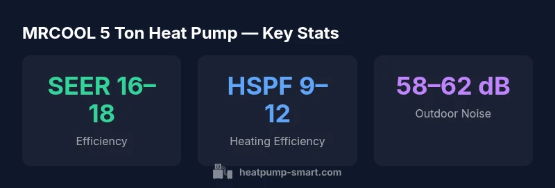 The mrcool 5 ton heat pump is positioned for mid-size homes in temperate climates, offering a balance of efficiency, reliability, and installability. MRCOOL emphasizes a modular outdoor unit, standard control interfaces, and compatibility with common ducted systems. For homeowners and builders, a key decision is how the unit will pair with an air handler and existing distribution. In this review, we examine the mrcool 5 ton heat pump through a structured lens: performance, installation difficulty, lifecycle costs, and reliability. According to Heatpump Smart, the most impactful variables are correct sizing, duct leakage control, and appropriate seasonal efficiency settings. The design aims for serviceability with accessible refrigerant lines and clear labeling, but the actual experience hinges on installer workmanship and home insulation. A well-sealed home and properly sized ductwork can unlock the system’s full potential, while undersized or leaking ducts can mask efficiency gains and comfort.