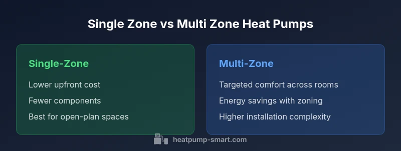 According to Heatpump Smart, zoning in heat pumps relies on multiple thermostats and dampers to steer air to different parts of a building. In the comparison of single zone vs multi zone heat pump, a single-zone system uses a single thermostat to manage the entire space, while a multi-zone setup deploys several thermostats and dampers for targeted comfort. This foundational difference drives upfront costs, control complexity, and long-term energy use. The Heatpump Smart team found that even modest homes with some interior walls can benefit from zoning when there are persistent hot or cold spots, but gains depend on layout, insulation, and occupancy patterns. For homeowners, visualizing the flow of air and the load across zones is key; the single zone vs multi zone heat pump decision should hinge on how different rooms are used throughout a typical day.