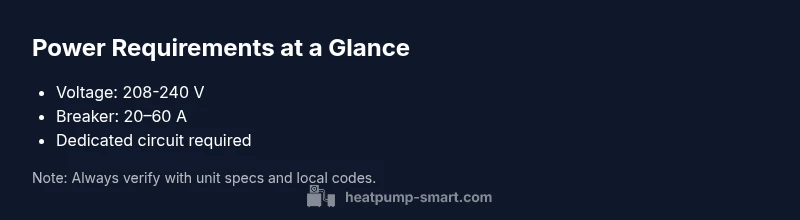 Heat pumps rely on electricity to move heat rather than generate it, so a reliable, properly sized electrical supply is essential. According to Heatpump Smart, the power source must be both capable of delivering peak starting current and safe under continuous operation. In most residential installations, this means a dedicated 208-240 V circuit on a single-phase supply. The exact breaker size depends on the unit’s rated load, efficiency rating (SEER and HSPF), and whether a high-velocity or standard unit is installed. A common rule of thumb is to size the circuit for the maximum continuous load plus a safety margin, typically resulting in a breaker range from 20 to 60 amps. In practice, a smaller 1.5–2 ton unit might use 20–30 A, while larger 3–4 ton setups trend toward 40–60 A. Always verify with the unit’s documentation and your electrician. This approach minimizes nuisance trips and ensures the outdoor unit has enough power for defrost cycles, compressors, and fans. In addition to voltage and amperage, check local code requirements for disconnects, grounding, and weatherproofing of outdoor equipment. The goal is a clean, safe, and future-ready connection that supports efficiency and reliability across seasons.