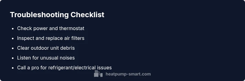 Heat pump problems typically fall into airflow, thermostat, refrigerant, defrost, and electrical faults. Start with simple checks: verify power, thermostat settings, and air filters; clear debris from the outdoor unit; listen for odd noises. If the issue persists, consult a professional. For more detail, see the full step-by-step guide.