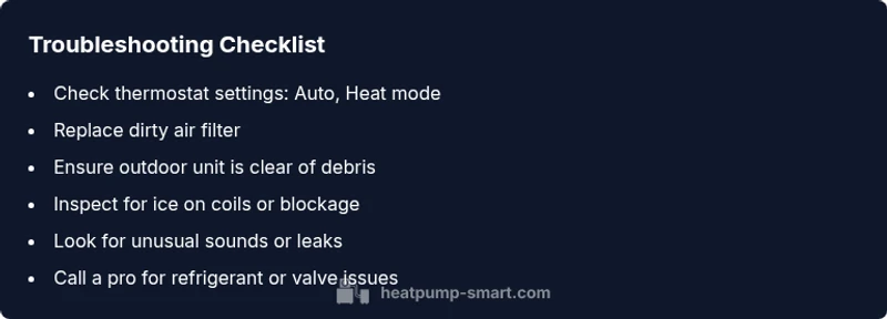 If basic checks don’t restore warmth, if you notice refrigerant signs, or if you hear unusual noises or smells, contact a licensed technician promptly.