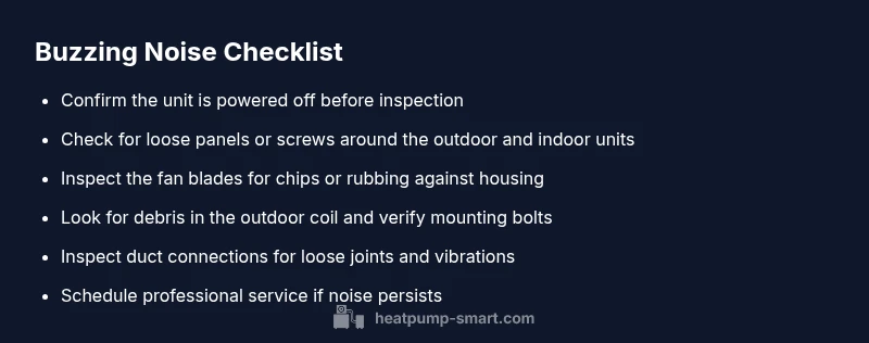 Buzzing noises from a heat pump can come from several sources. Typical culprits include loose mounting bolts or panels that vibrate when the compressor runs, rubbing or damaged fan blades, and loose connections in the outdoor unit. Ductwork can also vibrate if joints are loose or if restraints have degraded, transferring vibration into living spaces. Electrical components dining under load may emit a high-pitched or low buzzing; this is more serious and often requires a professional evaluation. Debris around the outdoor coil or blower wheel is another frequent offender. Heatpump Smart analysis notes that many buzzing issues stem from simple, preventable issues like loose screws or misaligned parts that can be fixed with basic tools and careful inspection.