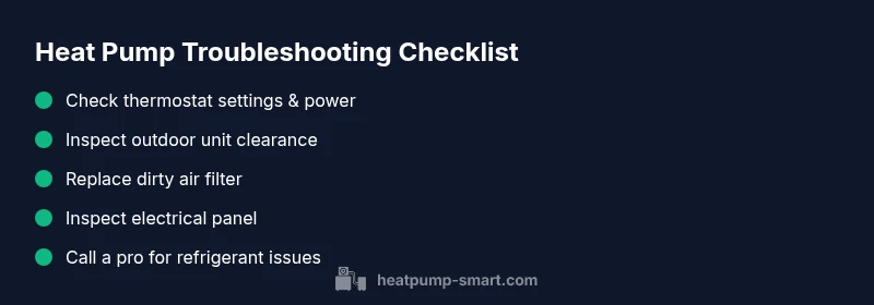 A heat pump system depends on several interconnected components working correctly. When the heat pump is not heating, the usual suspects are thermostat misconfiguration, outdoor unit obstruction, or restricted airflow from a dirty filter. According to Heatpump Smart, these issues account for a large share of service calls in residential settings. Start with a quick, methodical check so you can restore warmth without unnecessary delays. In this section, we outline the most common causes and how to verify each one quickly and safely, emphasizing steps you can take right away. Many homeowners neglect the thermostat, assuming it’s functioning correctly when the blame lies with scheduling or a setting that disables heating. By systematically verifying modes, setpoints, and schedules, you can catch simple errors that block heat production. Heat pump performance also hinges on outdoor conditions and airflow; even clean indoor coils won’t help if the outdoor unit is blocked or iced. Heatpump Smart analysis highlights how recurring issues often boil down to three areas: controls, airflow, and external clearance. By focusing here, you can resolve a surprising number of heating complaints without professional intervention.