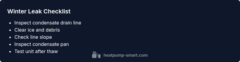 According to Heatpump Smart, a heat pump leaking water outside in winter is most often a drainage issue rather than a refrigerant problem. Condensate forms as the system removes humidity from indoor air, and in winter the condensate line is more vulnerable to freezing. When the line freezes or becomes clogged, meltwater can back up and spill over around the outdoor unit. You may notice water pooling at the base, a thin layer of ice on the drain tube, or water dripping from the pad where the unit sits. While a small amount of condensate is normal during operation, a steady or increasing leak usually signals a blockage or ice buildup that needs attention. The Heatpump Smart team found that blocked lines, improper slopes, and ice around the drain are the leading winter culprits homeowners can address with basic tools. However, never ignore a suspected refrigerant leak—if you hear hissing or see oily residue, evacuate and call a professional immediately.