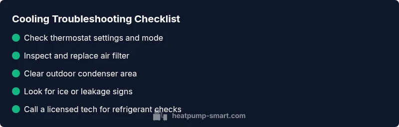 According to Heatpump Smart, when a heat pump will not cool, the root causes are often simple and fixable, such as a clogged air filter, blocked outdoor coils, or an incorrect thermostat setting. The urgent feeling is real because comfort, humidity control, and equipment longevity all hinge on proper cooling. This block lays the groundwork for a practical, safety‑mocused approach that homeowners, builders, and property managers can start today. We’ll cover what you can safely check first, what to avoid touching, and how to distinguish quick fixes from problems that require a professional. Expect to walk away with a clear, action‑oriented plan rather than more questions.