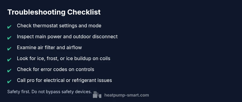 Use a structured diagnostic flow to move from symptom to solution. Start with the most likely causes (power, thermostat) and proceed to less obvious faults (sensors, switches). For each symptom, confirm the fault with a simple test (e.g., is power present, is thermostat communicating). If a test points to a single cause, apply the corresponding fix and re‑test. If multiple causes seem possible, address the easiest fix first to see if operation returns. This method reduces unnecessary parts replacements and helps you decide when professional inspection is warranted. Heatpump Smart’s approach emphasizes safety and staged checks to prevent damage and keep your system running efficiently.