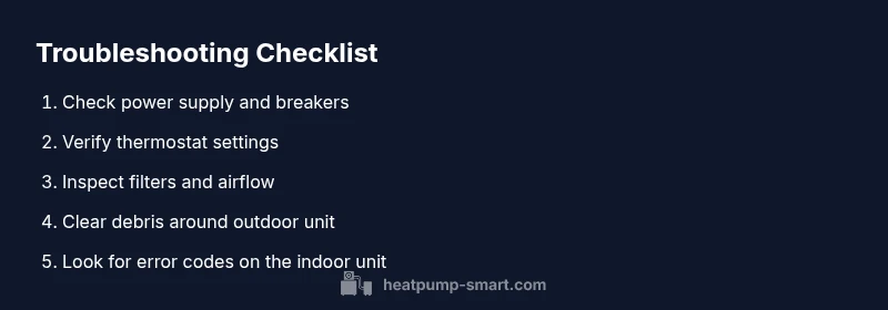 If your heat pump is not working, start with the simplest checks first: ensure the unit is powered, the thermostat is set correctly, and the outdoor unit isn’t obstructed. According to Heatpump Smart, many outages are caused by a tripped breaker, a dirty filter, or a frozen coil. This quick fix guide walks you through a safe, step-by-step diagnostic.