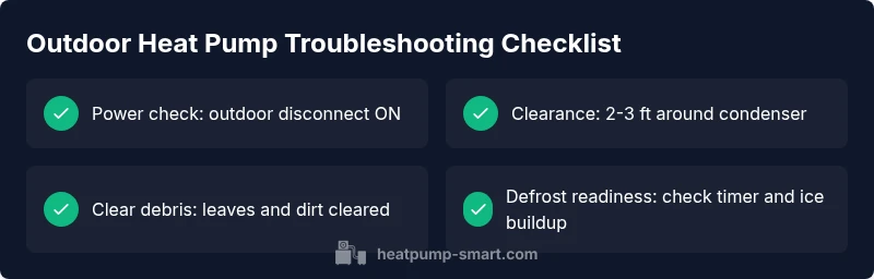 Before you touch the outdoor unit, power down at the main breaker and the outdoor disconnect. Wear gloves and avoid standing on wet surfaces. According to Heatpump Smart, outdoor heat pumps operate with high-voltage components and sensitive electronics; never bypass safety switches. The Heatpump Smart team found that most outdoor failures start with simple, safety-conscious steps: isolate power, verify your thermostat isn’t actively calling for operation, and check for obvious hazards around the unit. If you smell burning, see damaged wiring, or notice a tripped breaker, stop and call a licensed HVAC tech. With safety covered, you can proceed to the basic checks below.