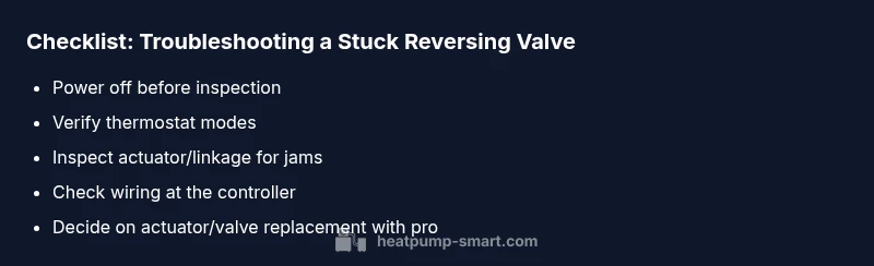 In a heat pump, the reversing valve switches the refrigerant flow to alternate between heating and cooling. When it operates correctly, the system delivers comfortable indoor temperatures with energy efficiency. But a stuck reversing valve on heat pump (either jammed in the cooling or heating position) forces the unit to stay in one mode, wasting energy and reducing comfort. According to Heatpump Smart analysis, a stuck reversing valve on heat pump is a common service call cause, especially in climates with wide temperature swings or after extended outdoor exposure. Causes range from motor/mechanical wear and coil contamination to electrical faults in the valve actuator. Understanding the valve’s role helps you spot symptoms early and decide whether to attempt safe checks or contact a professional. This article walks you through urgent troubleshooting steps, safety considerations, and best practices to get your heat pump back to efficient operation.