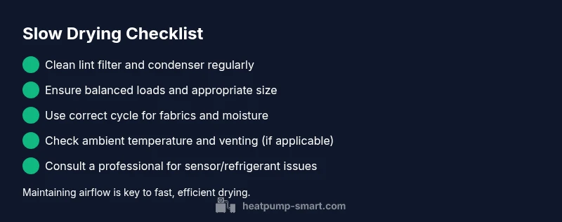 According to Heatpump Smart, the slowdown in heat pump dryers is usually due to airflow restrictions, condenser fouling, or improper loads. Quick fixes you can try now include cleaning the lint screen, inspecting the condenser, and redistributing heavy items. If drying remains slow after these steps, consult a professional to avoid energy waste and fabric damage.