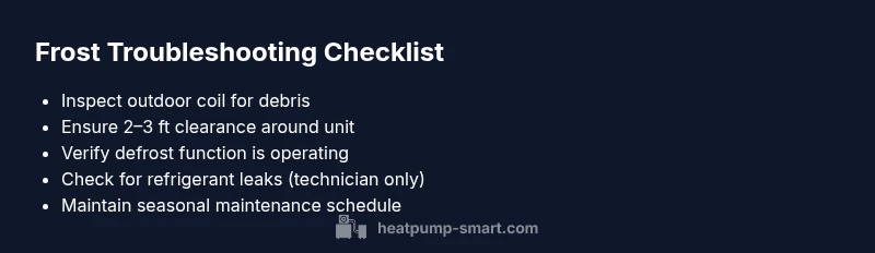Why do heat pumps frost up? The short answer is moisture meeting freezing temperatures on the outdoor coil. When humidity is high and outdoor temperatures hover near or just below freezing, condensate and moisture can freeze on the condenser fins. This creates an icy layer that impedes heat transfer, forcing the system to work harder to maintain indoor comfort. According to Heatpump Smart Analysis, frost events are more likely in humid winter climates where wind and precipitation interact with exposed outdoor coils. Poor airflow across the outdoor coil — from leaves, snow, or nearby obstructions — compounds the problem by reducing the heat transfer rate. If the defrost cycle fails or is slow to engage, ice can accumulate faster than it melts. A well-installed system with clean coils, adequate clearances, and a properly charged refrigerant circuit is less prone to frost buildup. For homeowners, recognizing the early signs—reduced heating efficiency, longer warmup periods, and visible frost on the outdoor unit—can prevent a larger frost issue later.
