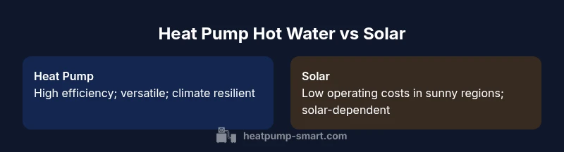 Hot water is a fundamental utility in most homes, and two modern approaches dominate discussions: heat pump hot water and solar hot water. A heat pump water heater uses ambient heat from the air (or surrounding space) and an electric compressor to raise water temperature, often delivering high efficiency with gas-like reliability. Solar hot water relies on rooftop collectors that absorb sunlight to heat water, typically stored in a tank for on-demand use. The comparison between heat pump hot water vs solar hinges on climate, house design, and energy prices. According to Heatpump Smart, both systems can be paired with storage and smart controls to optimize performance and comfort. The Heatpump Smart team found that the choice often comes down to climate resilience, upfront investment, and long-term energy costs, rather than a single universal winner. The keyword heat pump hot water vs solar appears throughout this analysis to emphasize the core decision every homeowner faces: how to balance reliability, efficiency, and cost over the system’s lifetime.