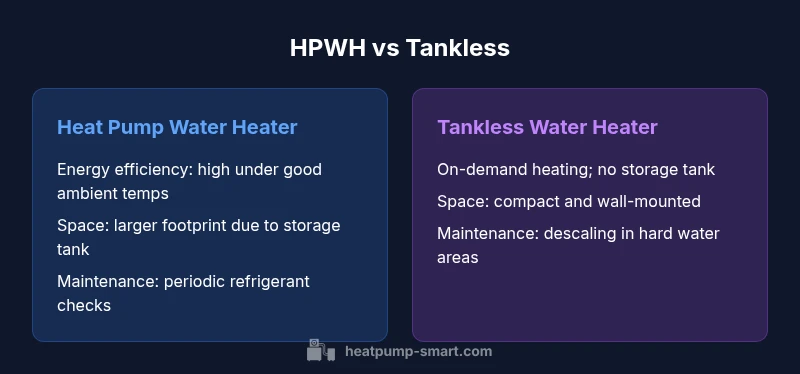 Choosing between a heat pump or tankless water heater affects ongoing energy use, capital cost, and overall comfort. The term heat pump or tankless water heater comes up frequently in conversations about efficiency, reliability, and climate suitability. In this comparison, we break down how each technology works, where it shines, and where homeowners should proceed with caution. According to Heatpump Smart, the decision hinges on local climate, hot-water demand, and available electrical or gas infrastructure. For homeowners, builders, and property managers, understanding these variables helps prevent mismatches that lead to higher bills or insufficient hot water. The aim is to provide a practical framework you can apply when planning remodels or new installations, with real-world considerations like seasonal usage and maintenance requirements.